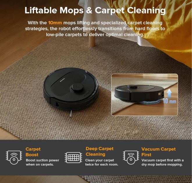 The T8 AIVI boasts an advanced AI technology to identify and avoid obstacles, an HD camera for remote monitoring, and strong mopping capability. It’s built for tech enthusiasts who enjoy cutting-edge technology in their cleaning devices.